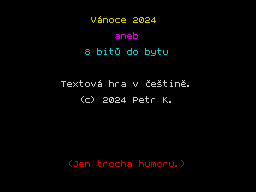 Tato textová hra od Petra Kaina není plnohodnotným titulem. Jedná se o takovou malou legrácku, jelikož se celá odehrává na ploše pouhé jedné obrazovky. To je myslím dostatečná záruka na to, že tuto hru dokáže dohrát opravdu každý. Všichni zvídavci se v závěru dozví, co na ně čeká pod vánočním stromečkem za dárek. Dohrání hry je otázka maximálně jedné minuty, ale když se nám blíží vánoční čas, tak proč tento titul nepřidat na tyto stránky, obzvlášť když se jedná o hru z domácí produkce.